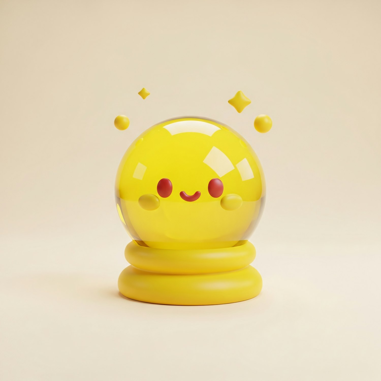 A cute yellow spherical character with a smiling face and floating elements, set against a neutral background.