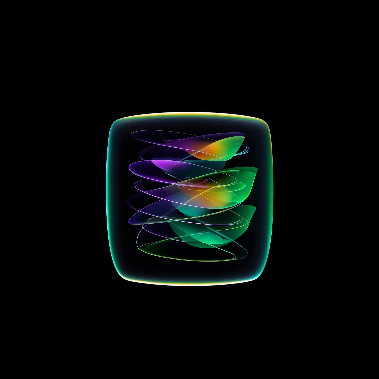 A glowing, multicolored abstract 3D shape with overlapping layers on a black background, creating a futuristic and dynamic visual.