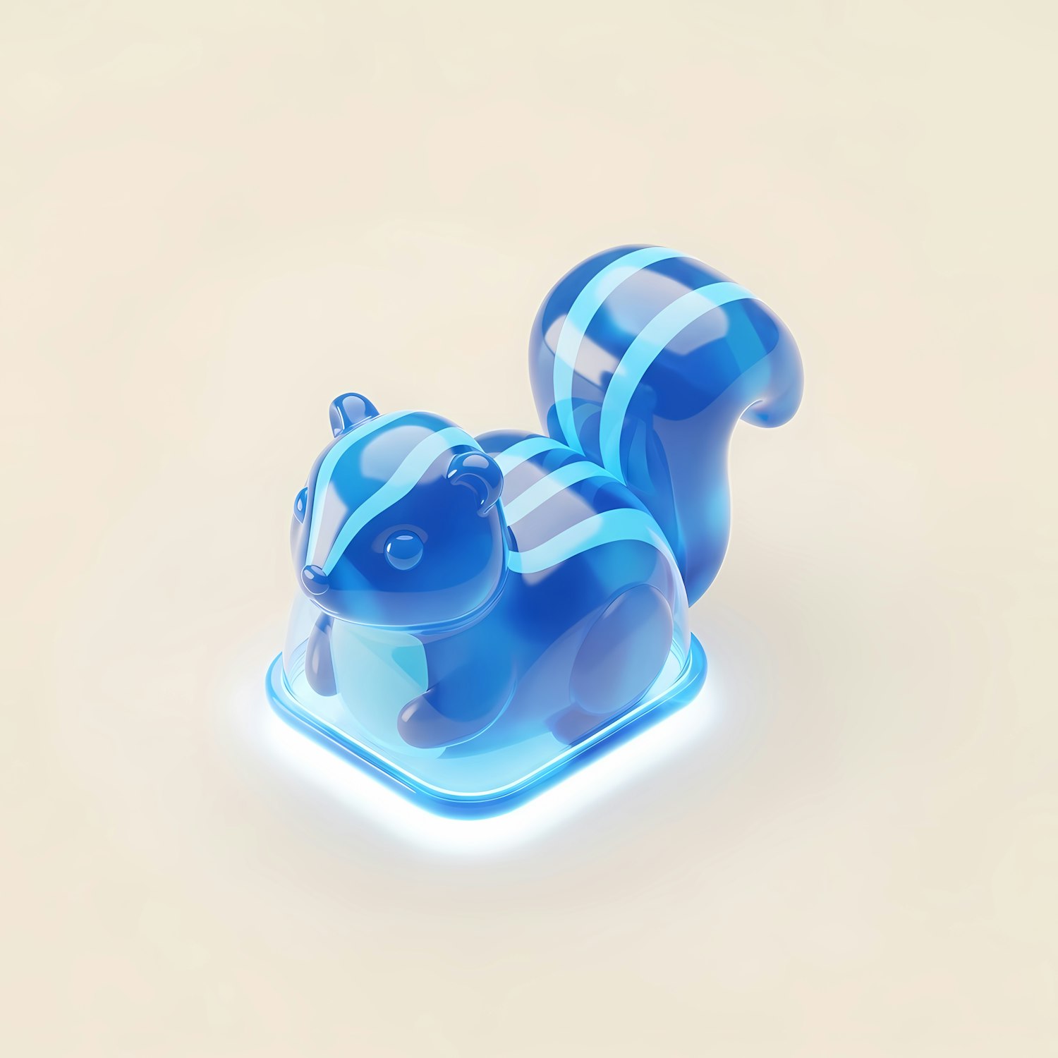 A glowing blue 3D squirrel figurine with a translucent design and luminous accents, set against a soft neutral background.