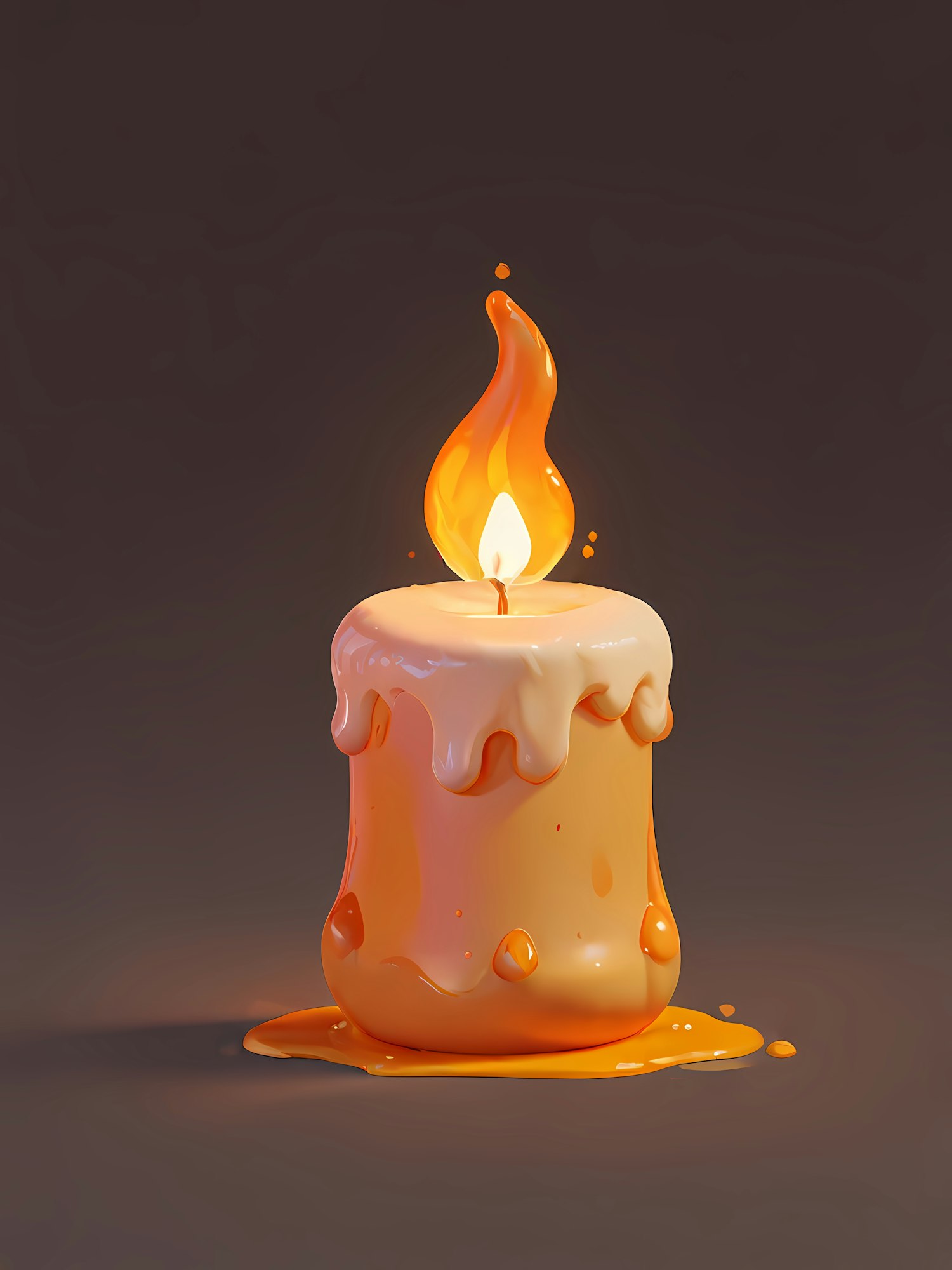 A glowing 3D-rendered candle with dripping wax and a vibrant orange flame against a dark background. Perfect for cozy or atmospheric designs.