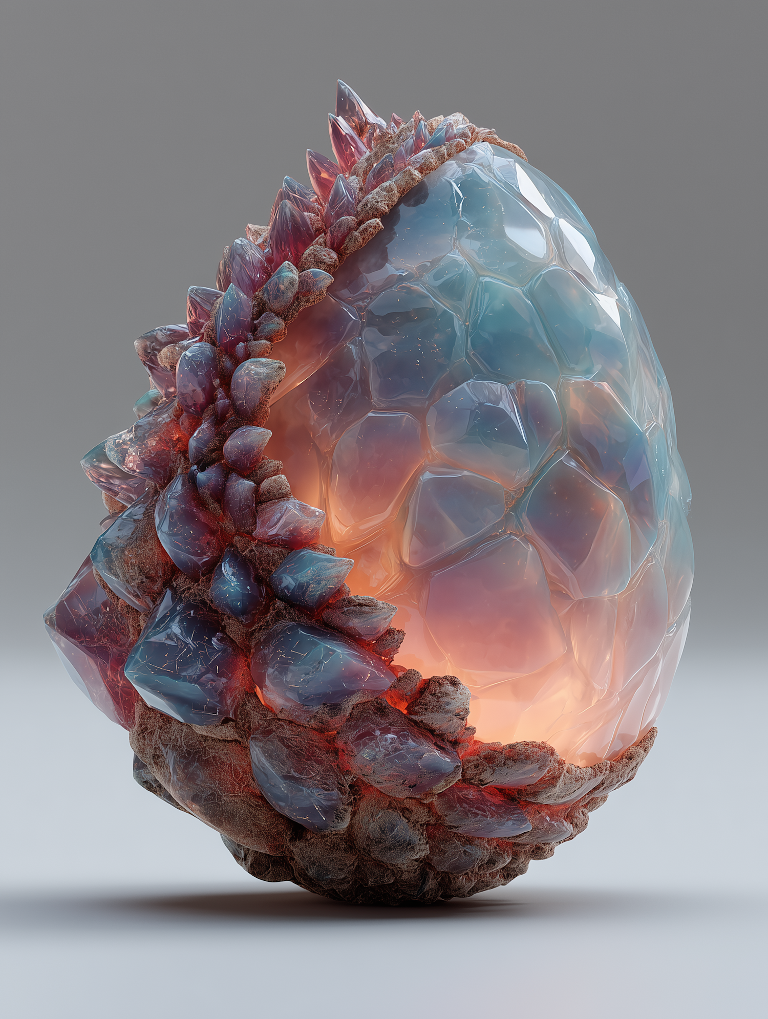 A glowing, crystalline egg-like object with intricate textures and vibrant colors, radiating a magical and otherworldly aura.