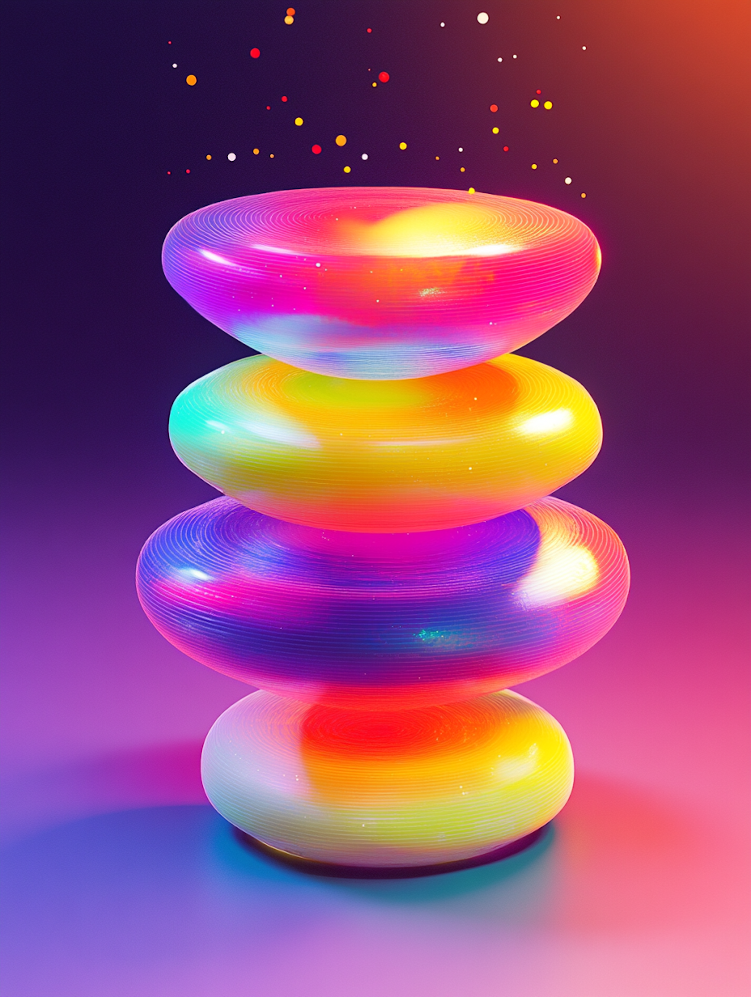 A stack of glowing, colorful donut-shaped objects with neon gradients and floating particles on a vibrant purple-orange background.