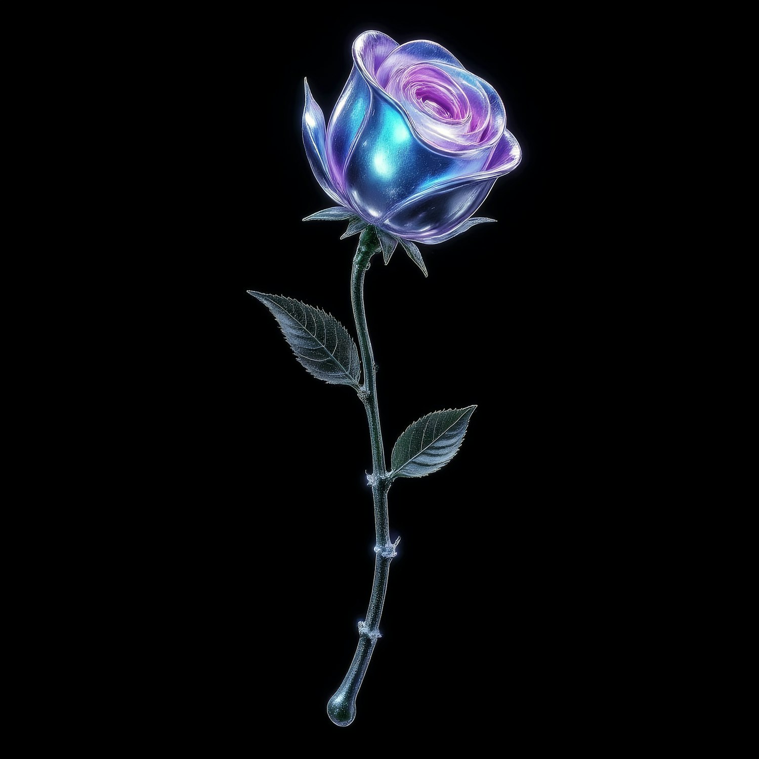 A glowing, translucent rose with vibrant purple and blue hues against a black background, creating a striking and ethereal visual.