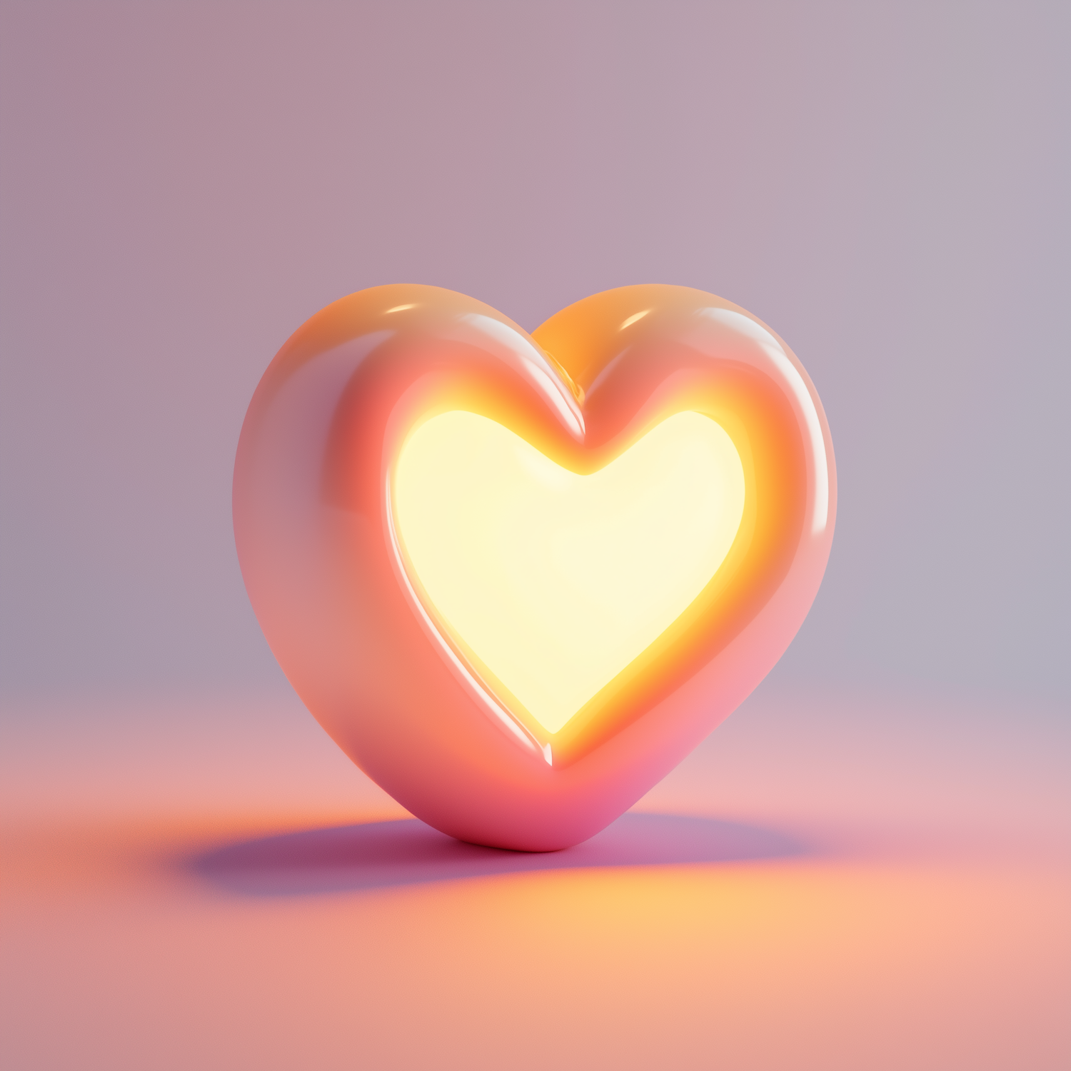 A glowing heart-shaped object with a warm yellow center and pink exterior, set against a soft gradient background.