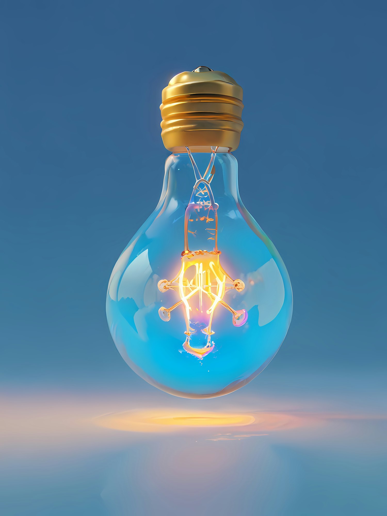 A glowing light bulb with a golden base and warm filament, floating against a smooth blue background. Minimalistic and vibrant design.