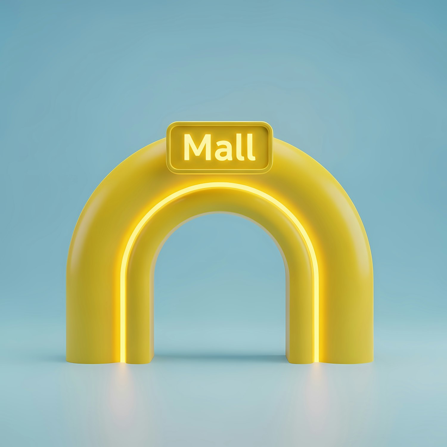 A vibrant 3D-rendered yellow arch labeled 'Mall' with glowing accents, set against a clean light blue background.