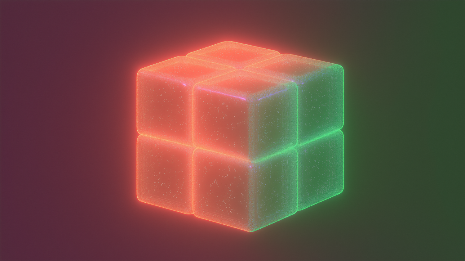 A glowing red and green cube with a neon effect on a dark gradient background, creating a futuristic and abstract vibe.