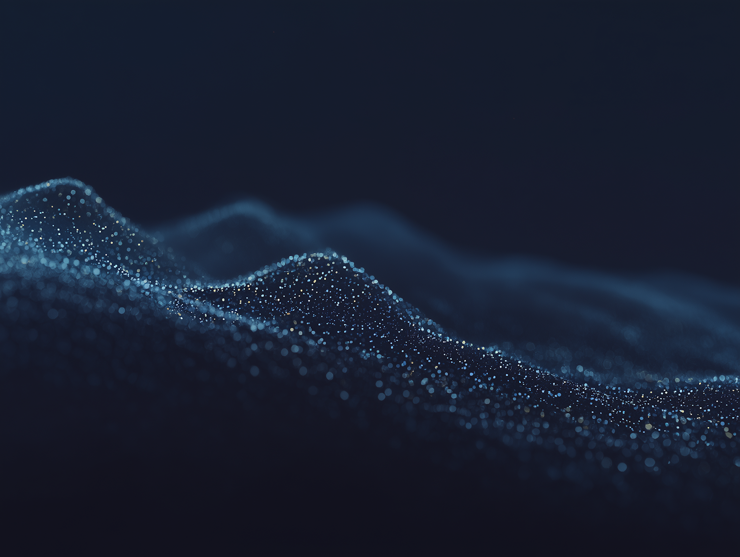 Abstract glowing particles on a dark, wave-like surface, creating a mesmerizing and mysterious visual effect.
