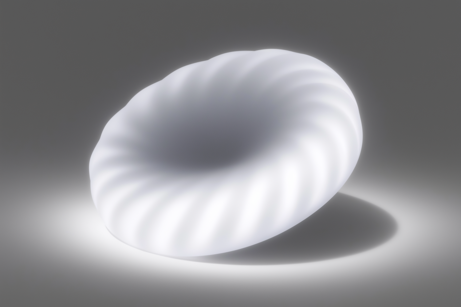 A glowing white toroidal object with a twisted surface pattern, set against a neutral gray background, exuding a modern and minimalistic design.