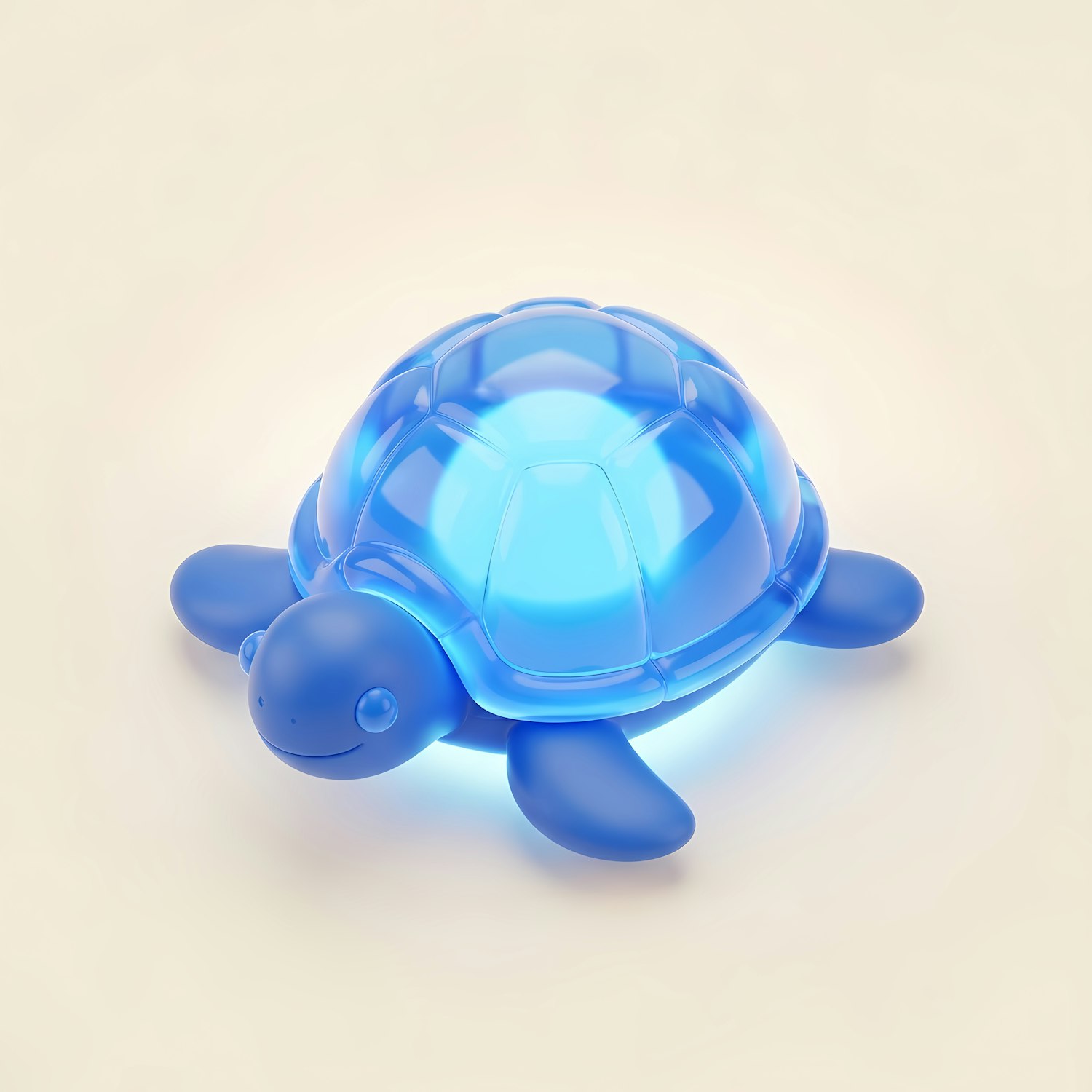 A glowing blue turtle-shaped object with a translucent shell, set against a soft beige background, showcasing a modern and playful design.