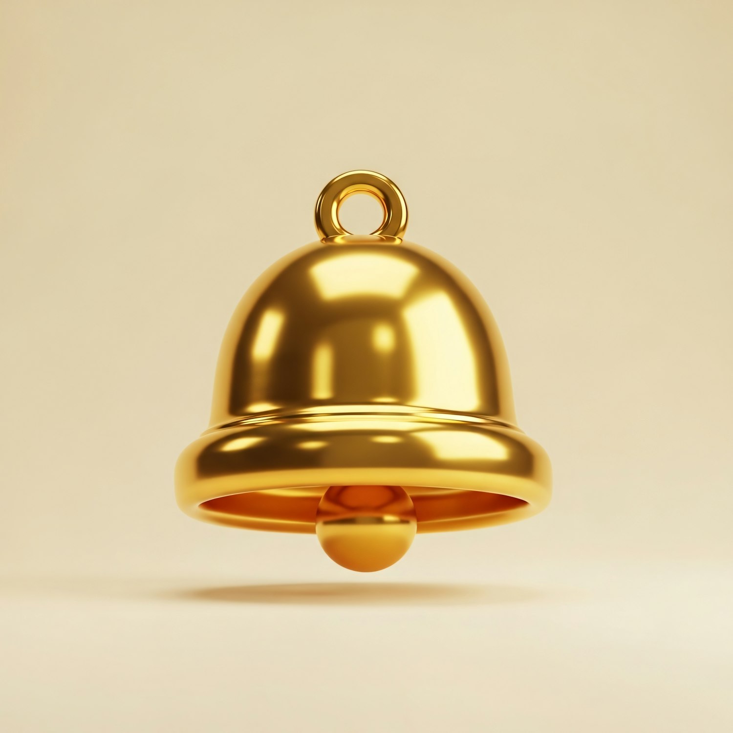 A shiny golden bell with a smooth surface, rendered in 3D, set against a neutral beige background, showcasing its reflective texture.