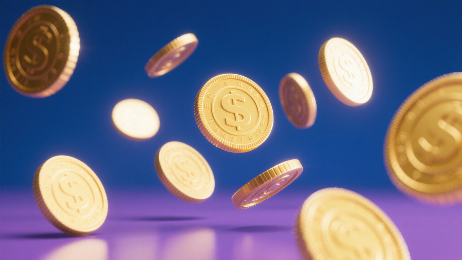 Golden coins with dollar signs floating against a blue and purple gradient background, creating a dynamic and vibrant visual.