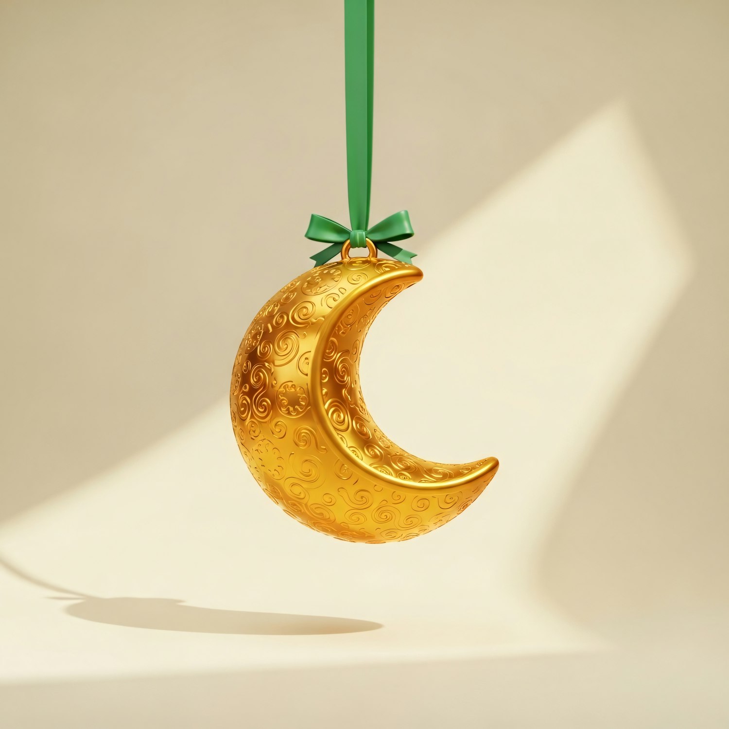 Golden crescent moon ornament with intricate patterns, hanging by a green ribbon against a softly lit beige background.