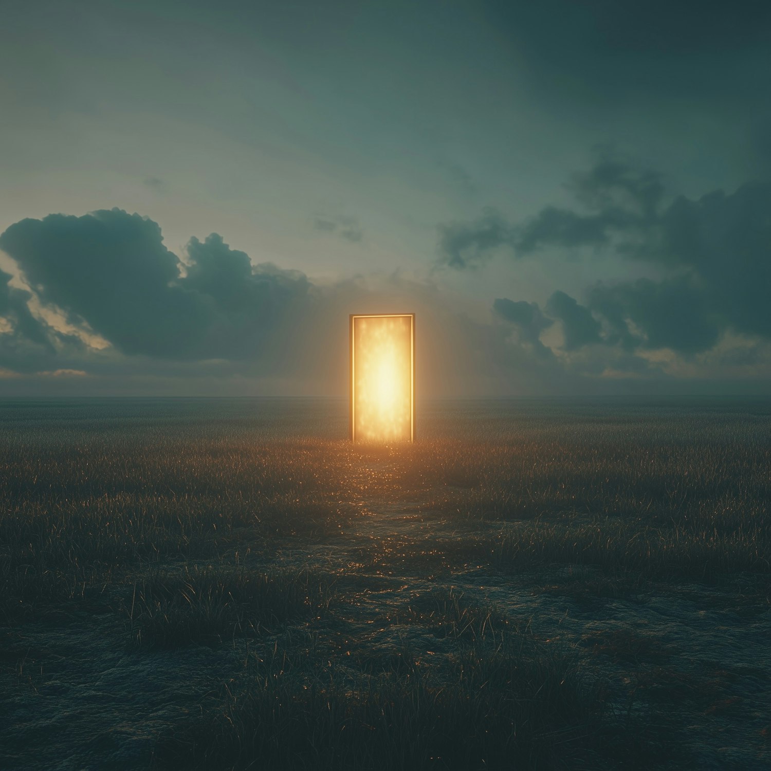 A glowing golden portal stands in a dark, grassy field under a dramatic cloudy sky, creating a mysterious and surreal atmosphere.
