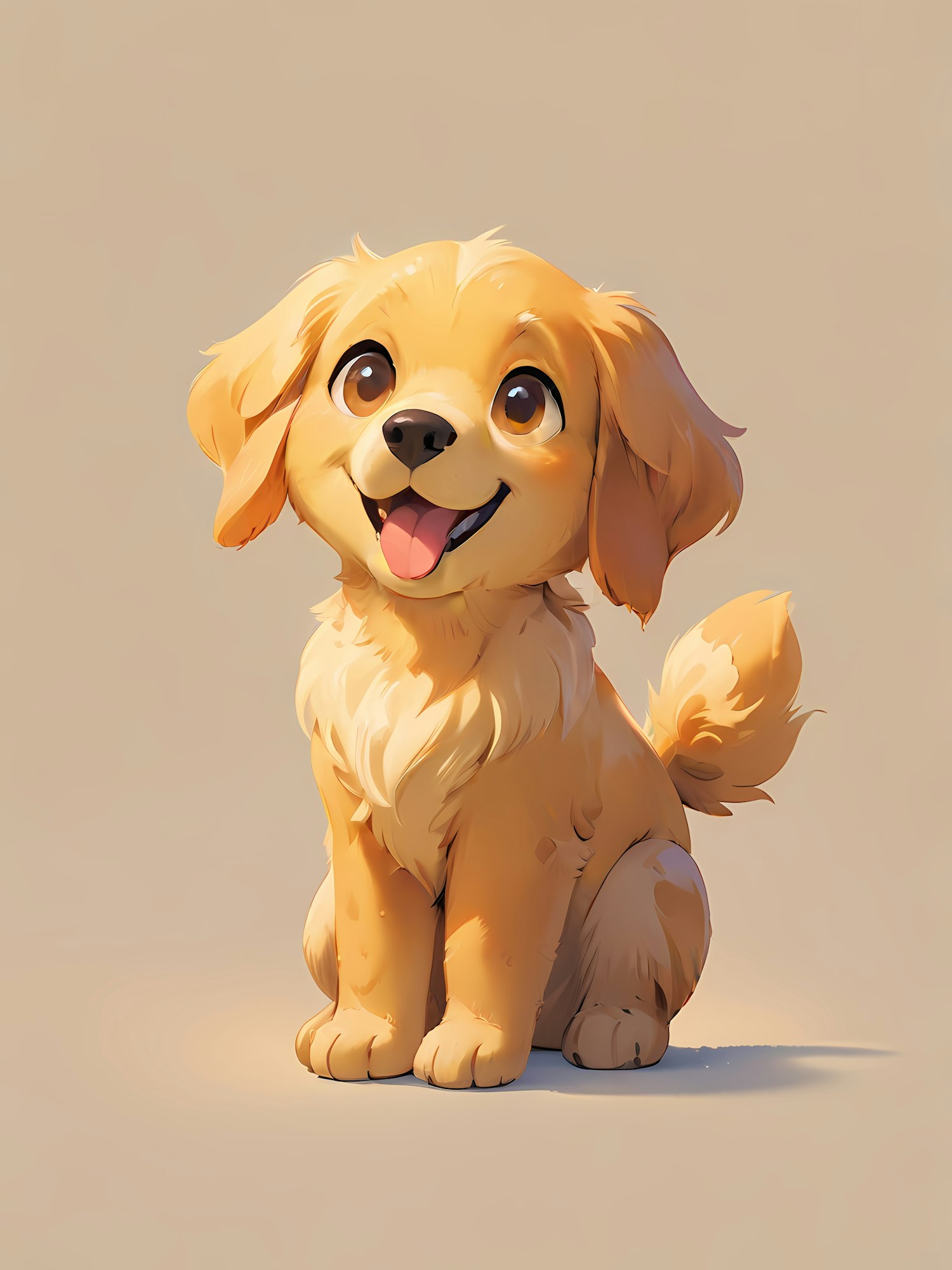 Adorable golden retriever puppy illustration with fluffy fur, big brown eyes, and a playful smile on a neutral beige background.
