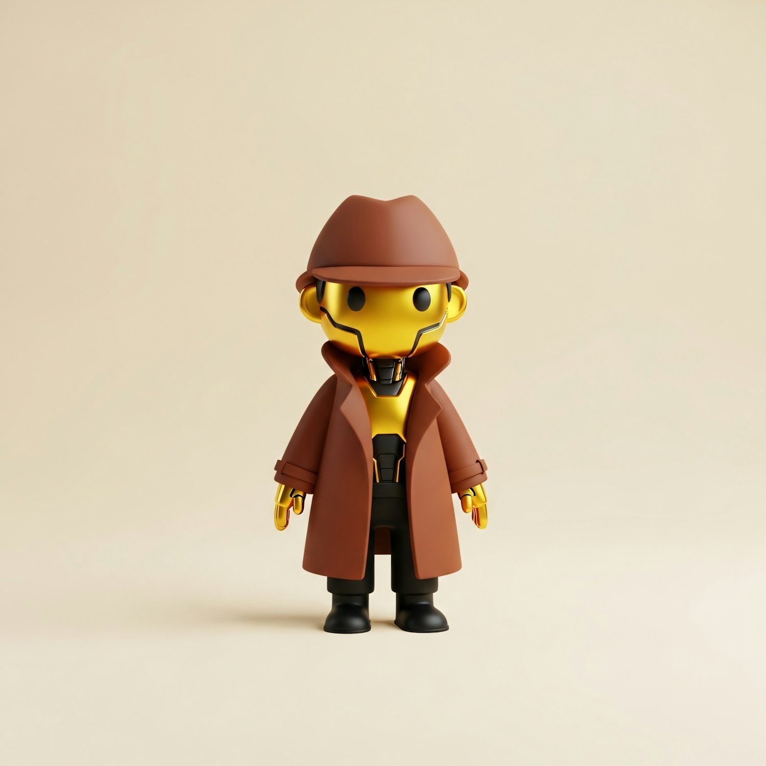 A golden robot in a brown trench coat and hat, blending futuristic and classic detective styles, set against a neutral background.