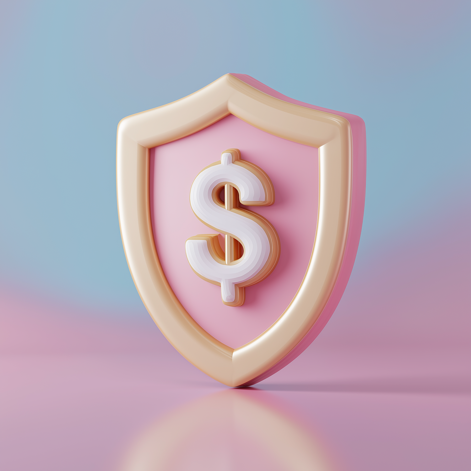 Stylized 3D golden shield with dollar sign, symbolizing financial protection or savings, set against a gradient blue and pink background.