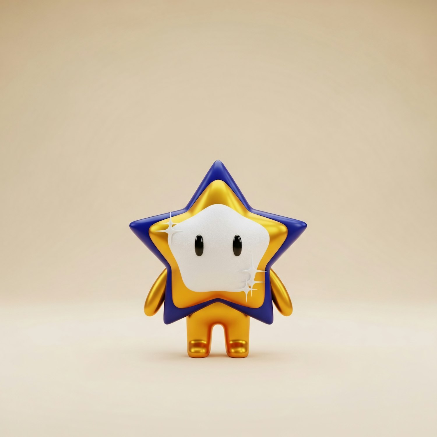 A cute 3D star character with a golden and blue design, featuring a white face and expressive eyes, set against a neutral background.
