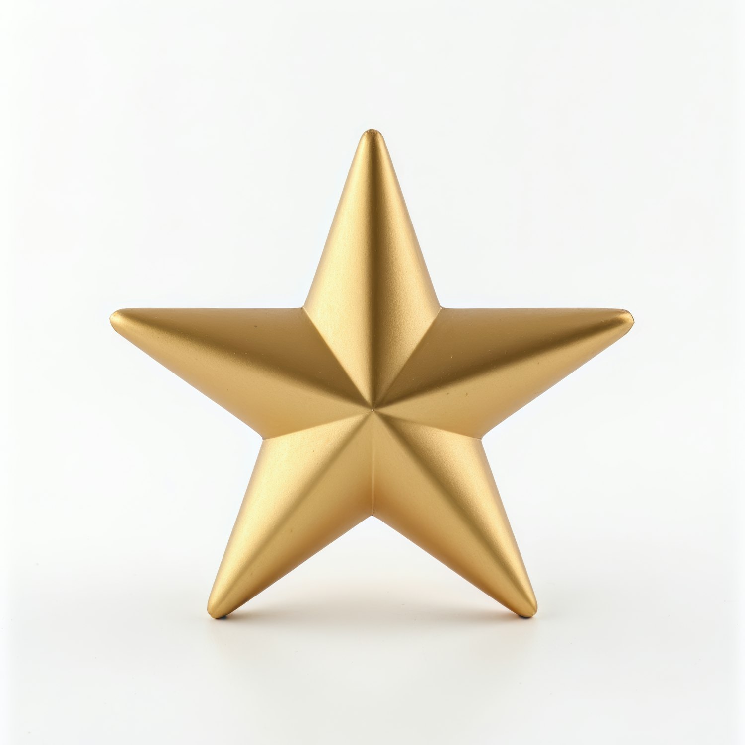 A shiny metallic gold star with five points on a plain white background, showcasing its elegant and polished appearance.