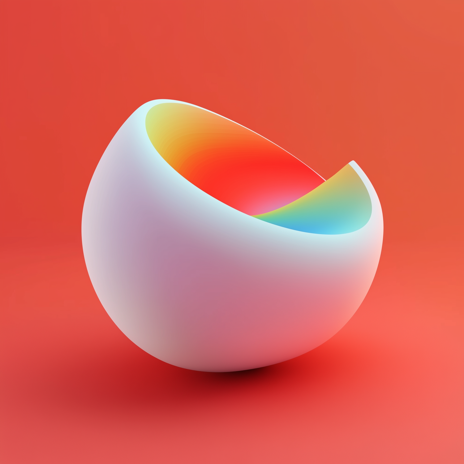 A sleek 3D-rendered bowl with a white exterior and vibrant rainbow gradient interior, set against a warm orange background.