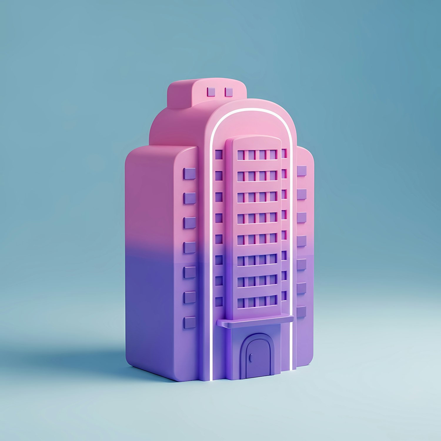 A vibrant 3D-rendered building with a pink-to-purple gradient, set against a light blue background, showcasing modern and minimalistic design.