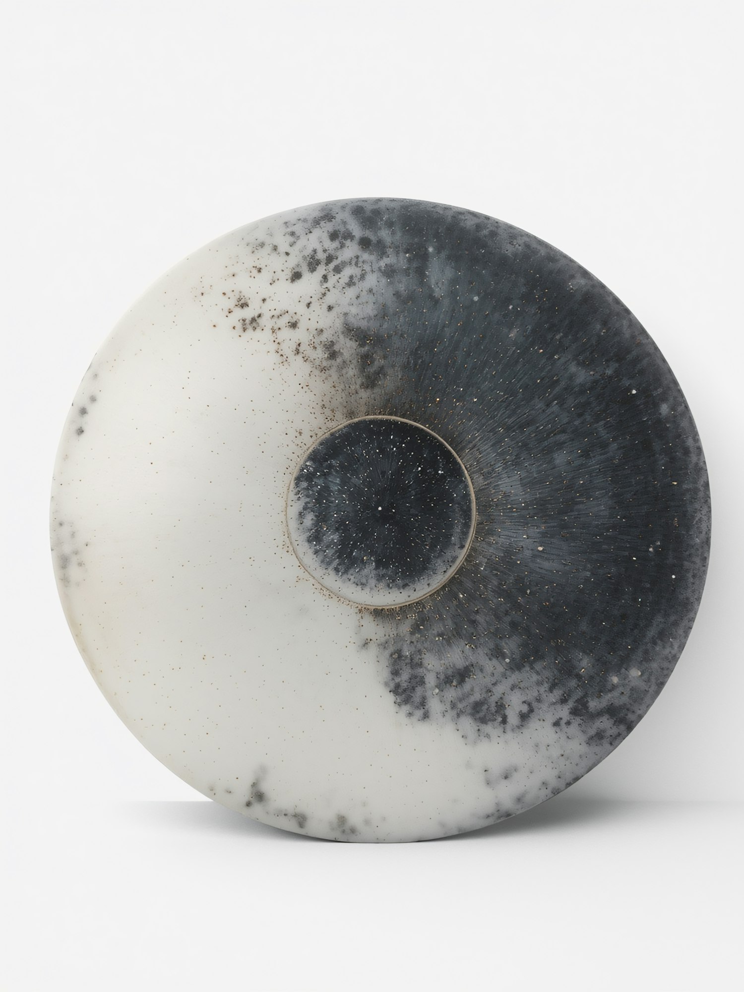 A round ceramic piece with a white-to-gray gradient and speckled texture, showcasing a central indentation for a modern aesthetic.