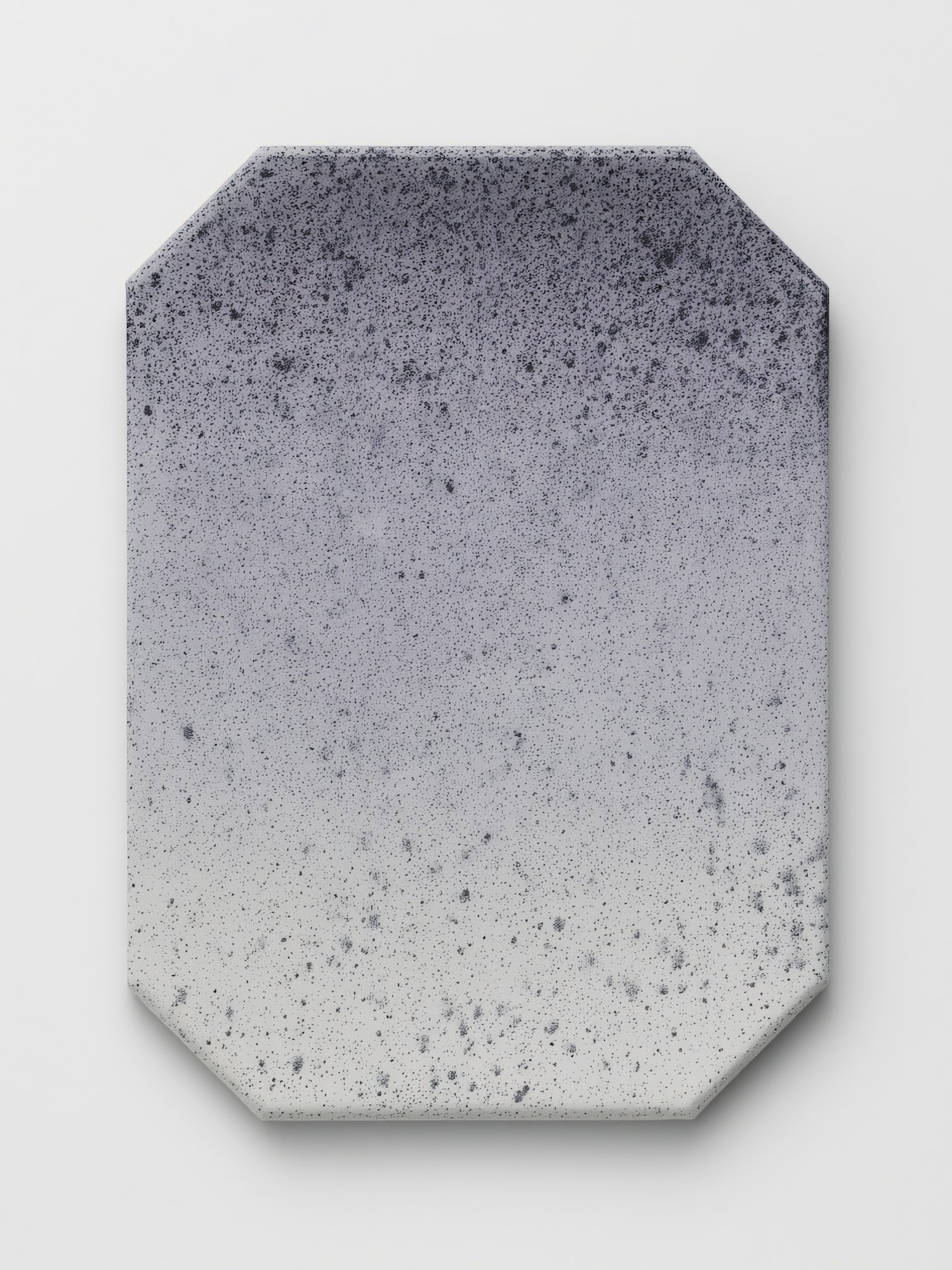 A modern ceramic plate with a gradient speckled design, transitioning from light to dark gray, set against a clean white background.