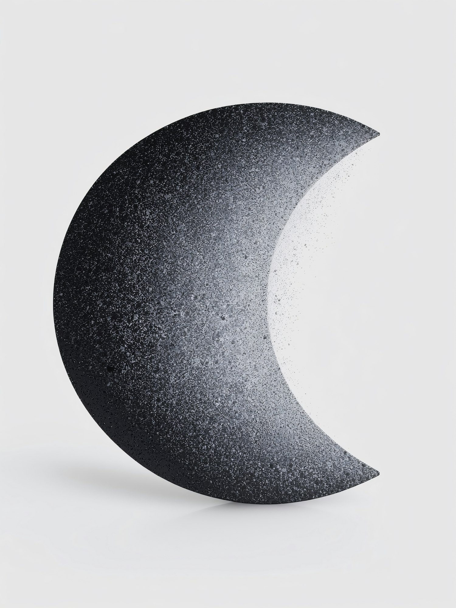 Abstract crescent-shaped artwork with a speckled gradient texture on a clean white background, evoking a celestial or cosmic feel.