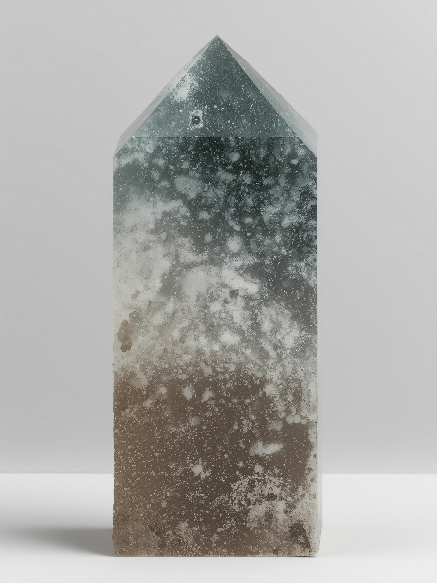 A polished crystal obelisk with a green-to-brown gradient and white speckles, set against a neutral background for a clean look.