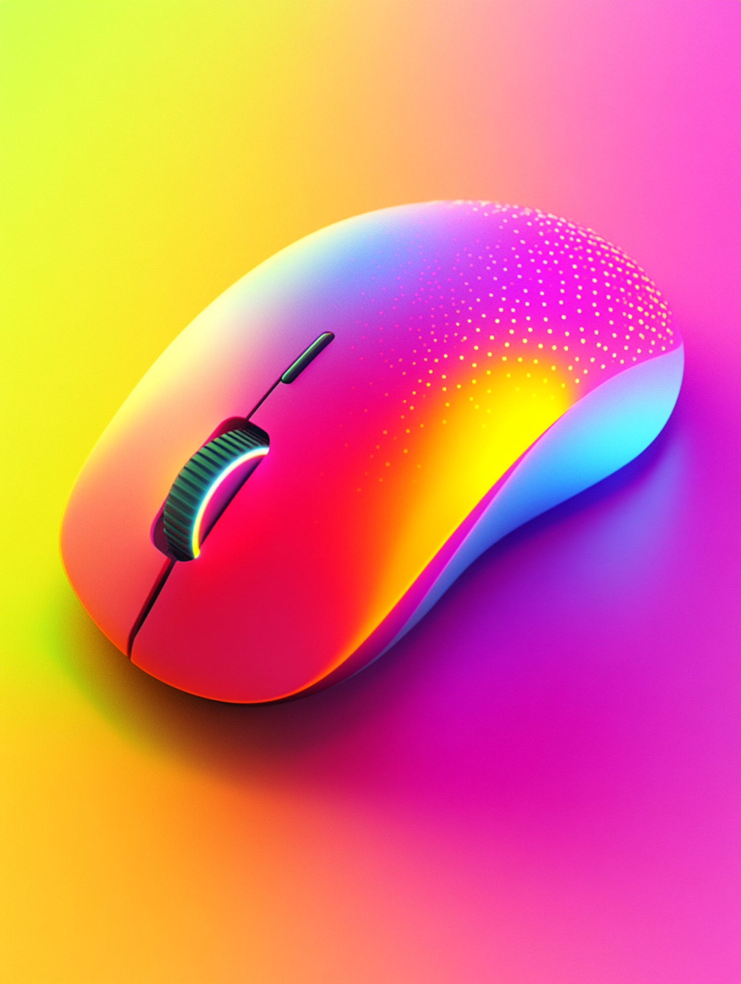 A vibrant gradient computer mouse with neon pink, yellow, and blue hues, glowing scroll wheel, and dotted texture for grip.