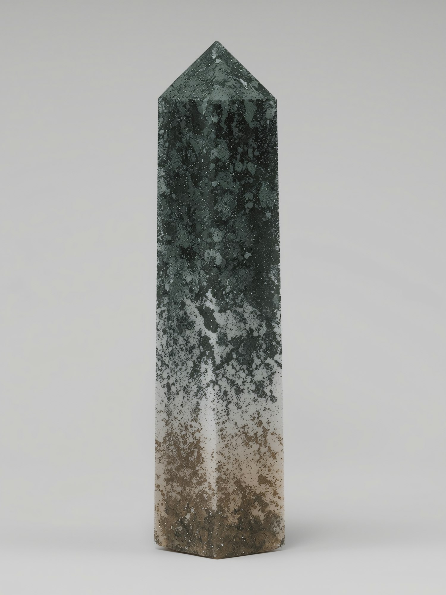 A hexagonal obelisk with a gradient from green to brown, featuring a speckled mineral-like texture, set against a neutral background.