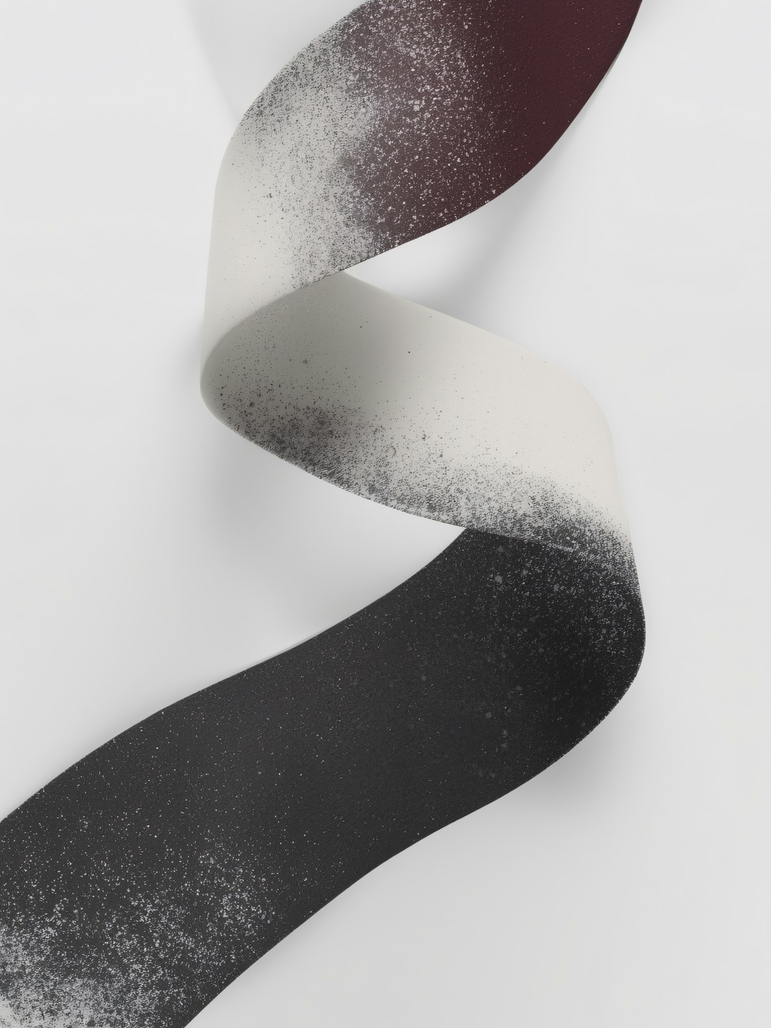 A twisted ribbon with a gradient from black to white to maroon, featuring a speckled texture, set against a clean white background.