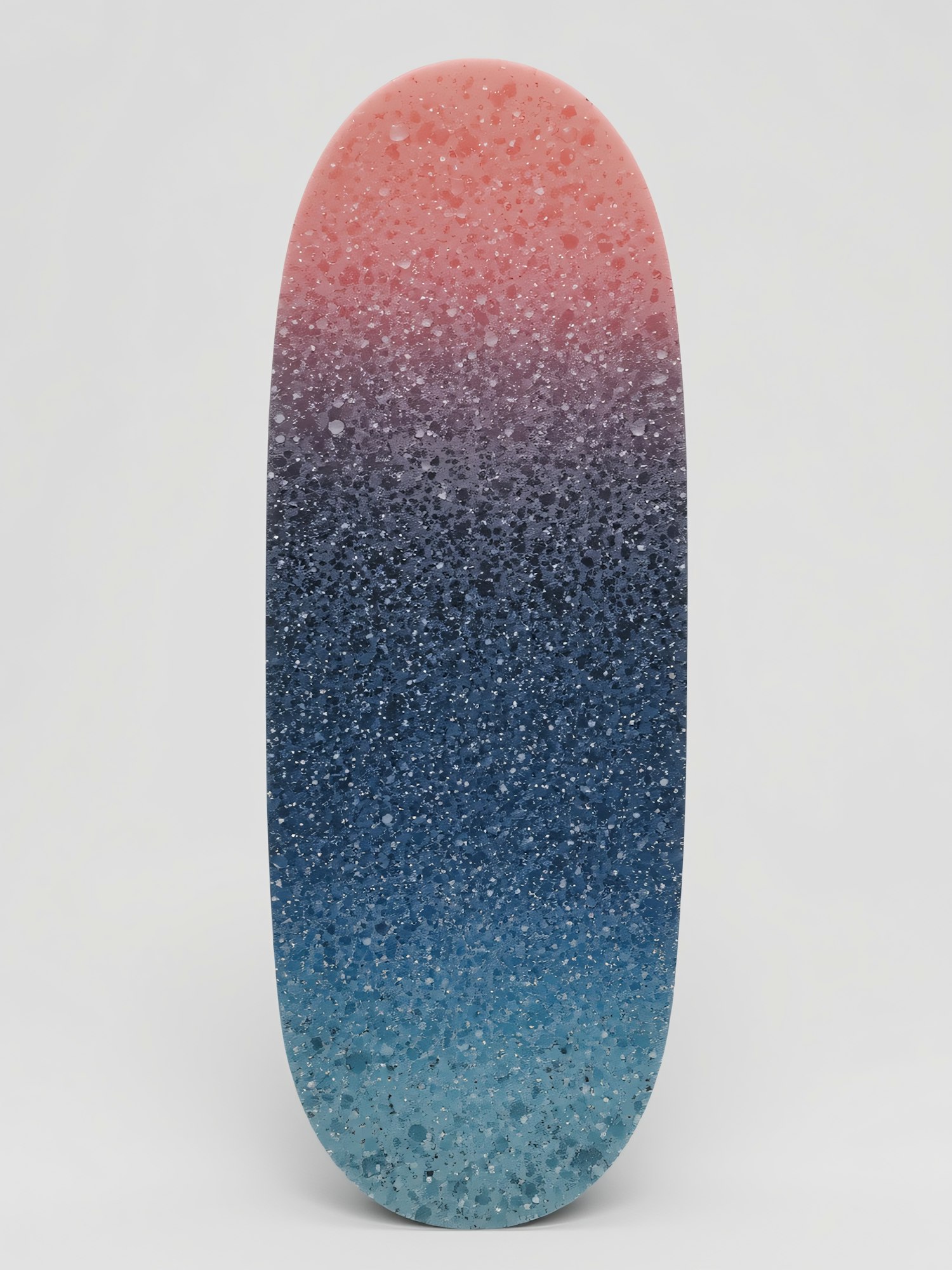 Gradient skateboard deck with pink to blue hues and a speckled texture, set against a clean white background.