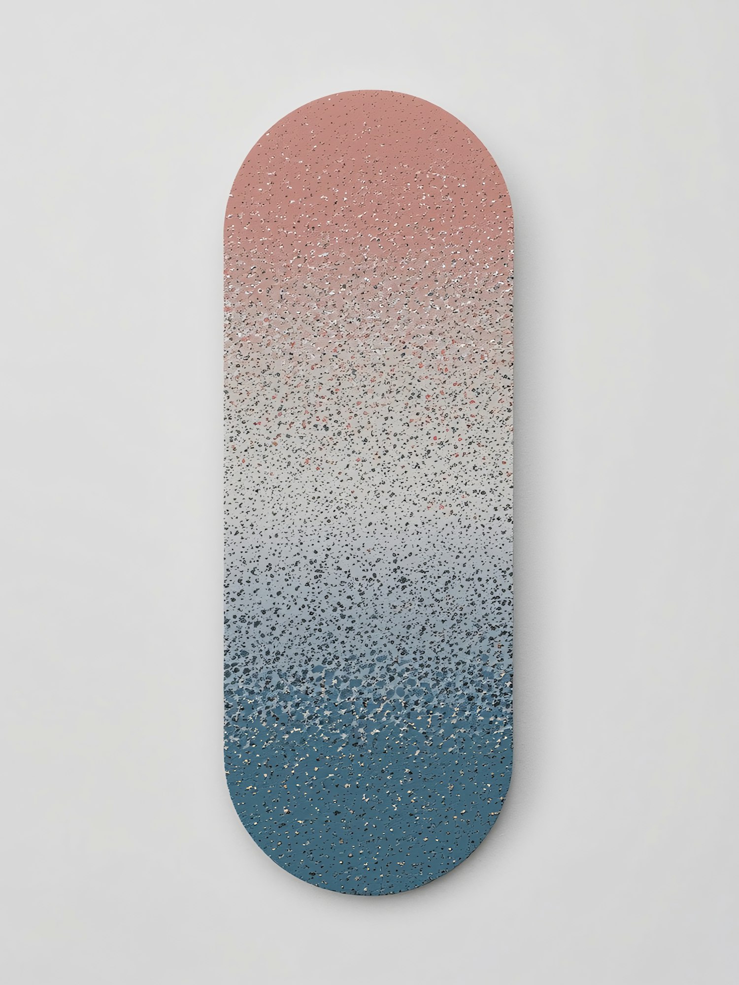 A skateboard deck with a pink-to-blue gradient and speckled design, perfect for modern and stylish skateboarding enthusiasts.