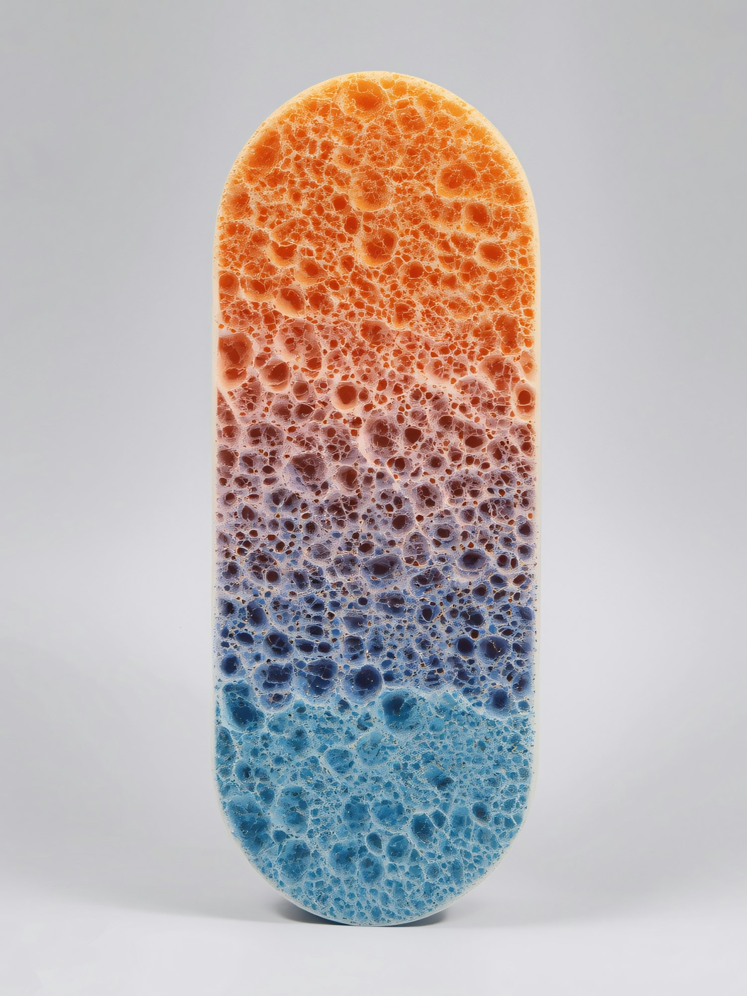 A colorful, porous oval object with a gradient from orange to blue, set against a neutral gray background, showcasing its texture.