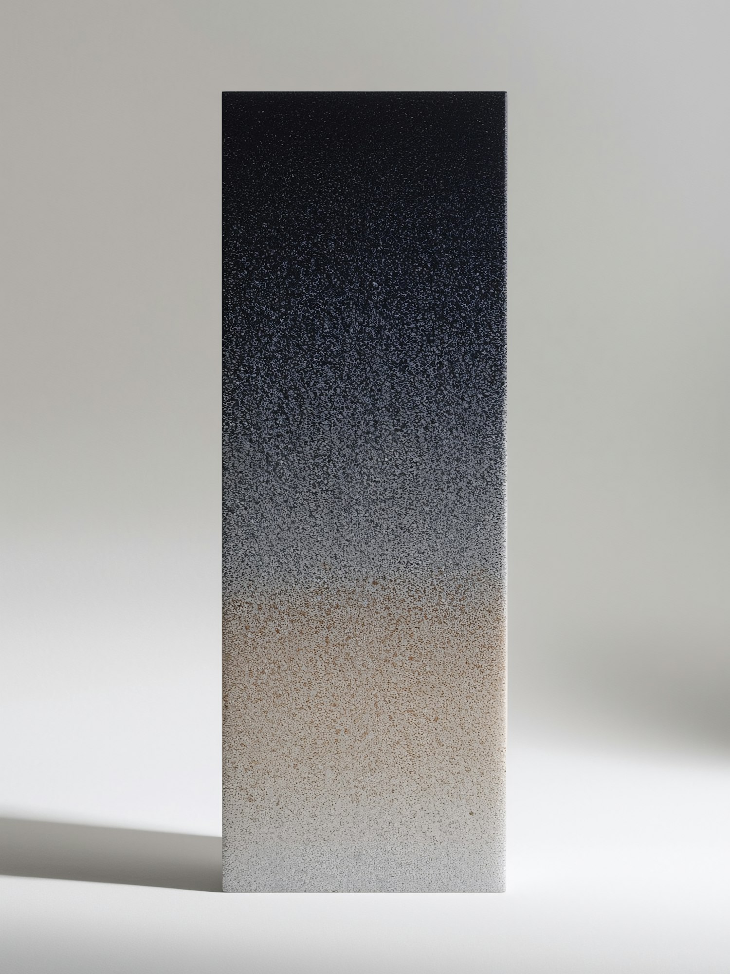 A rectangular object with a speckled gradient from black to beige, set against a neutral background with soft lighting.
