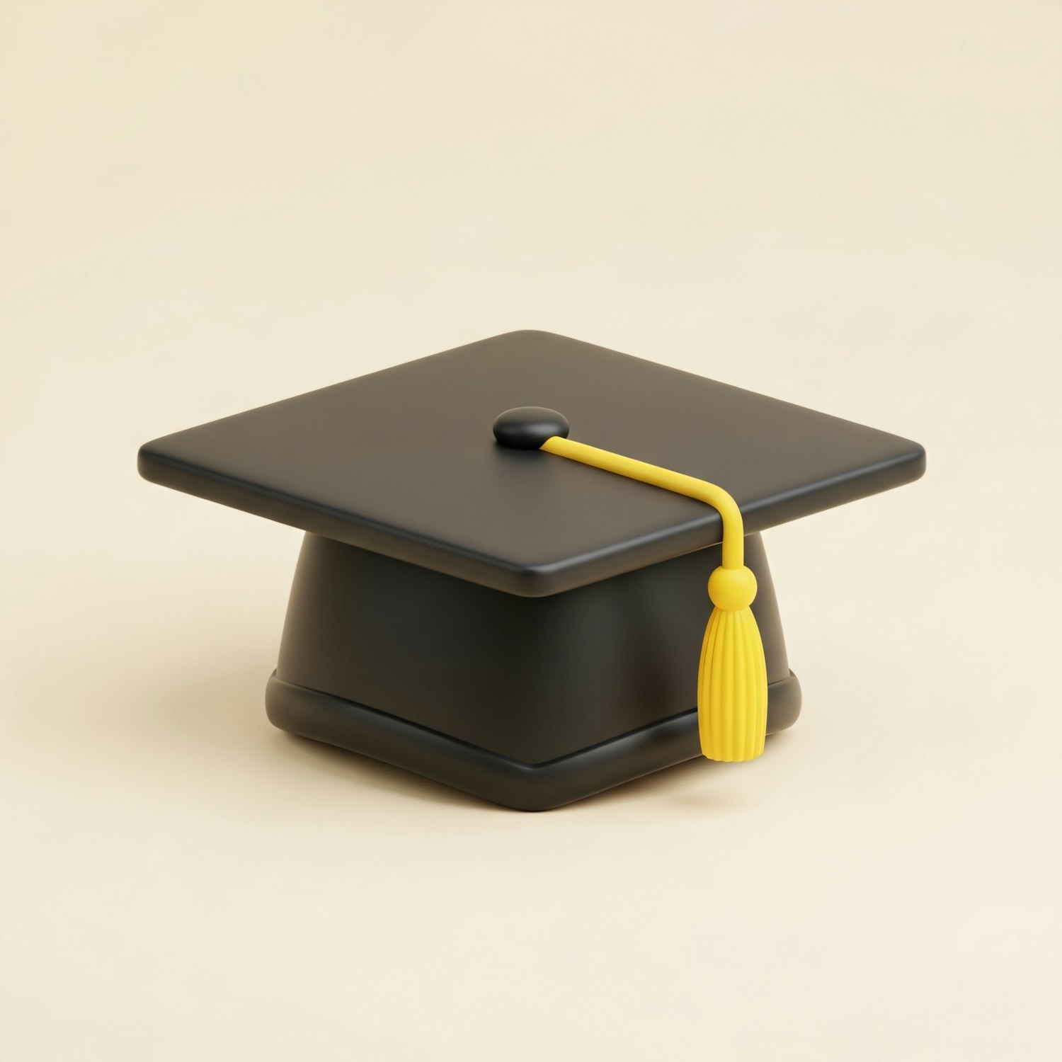 A sleek black graduation cap with a vibrant yellow tassel, rendered in 3D against a neutral background, symbolizing academic achievement.