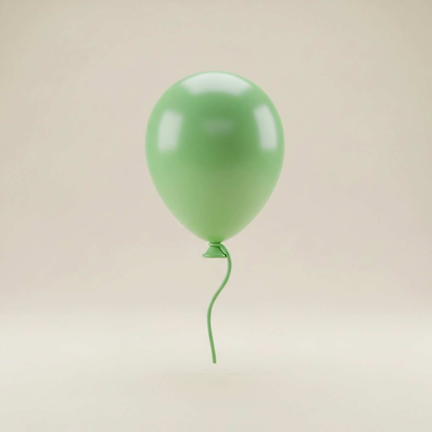 A green balloon with a glossy finish floats against a beige background, tied with a loose string, creating a minimalist and serene scene.