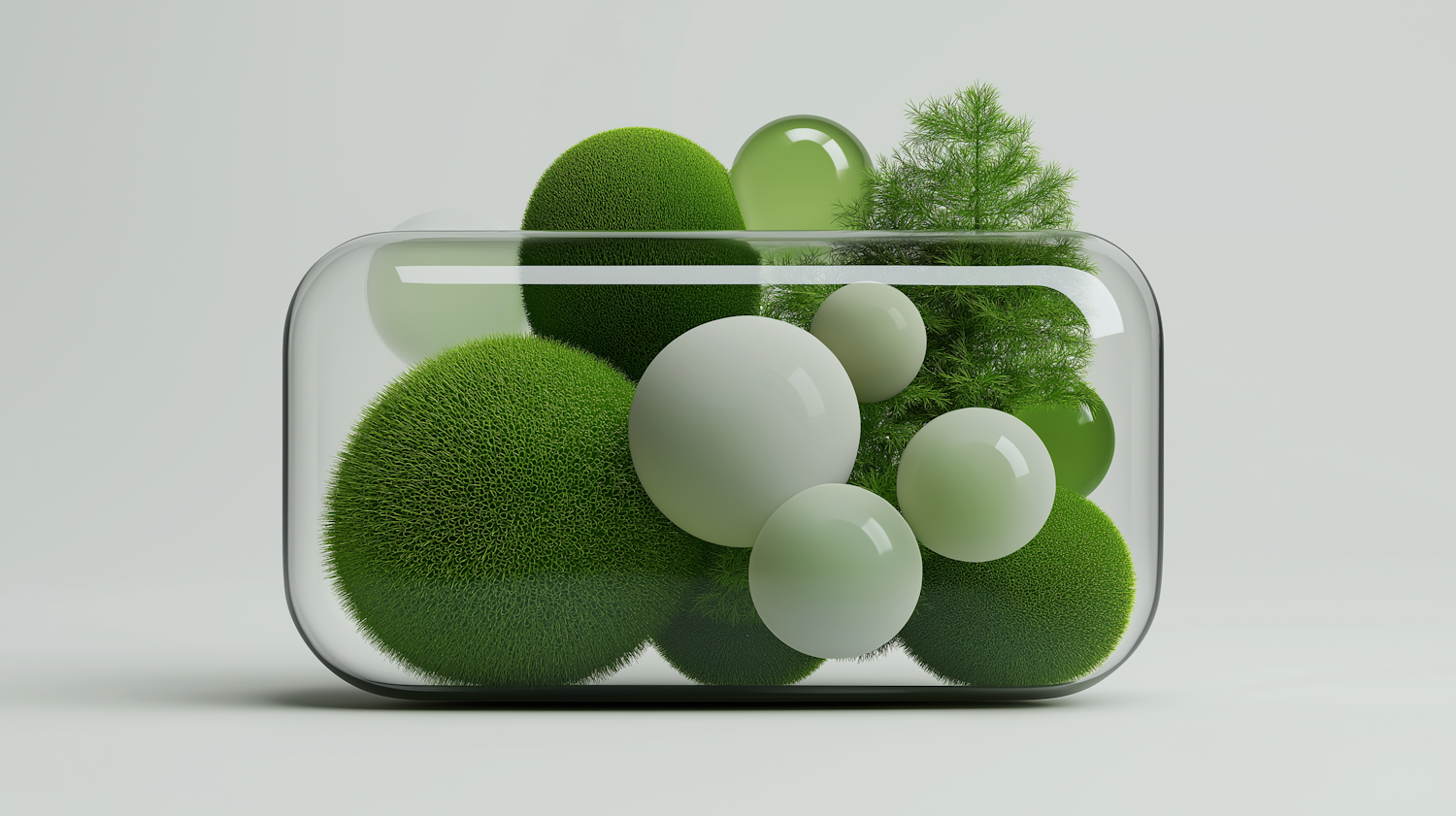 A 3D-rendered transparent capsule containing green spheres and plant-like textures, set against a clean white background.
