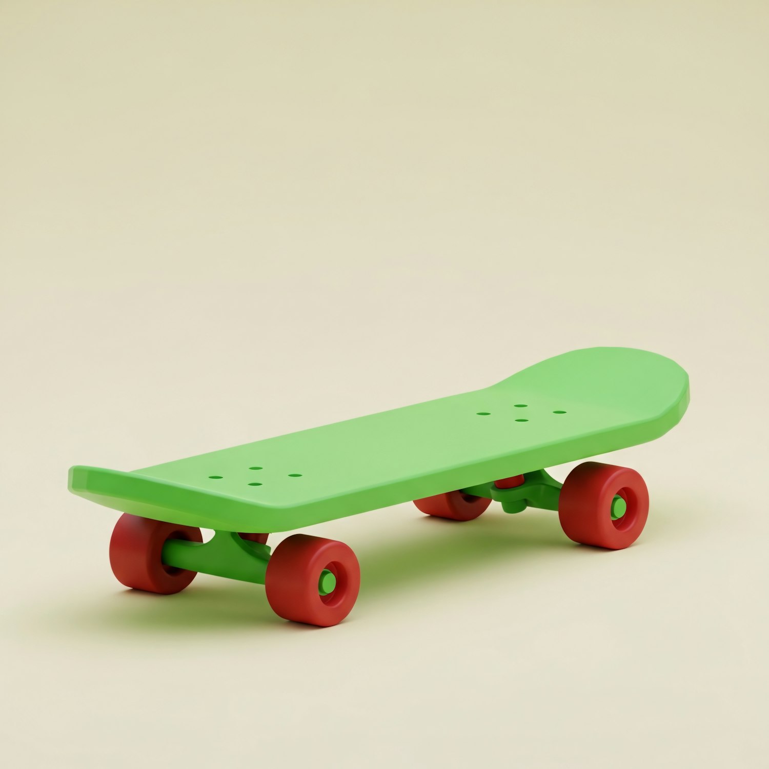 A green skateboard with red wheels, featuring a sleek and modern design, displayed on a neutral background.