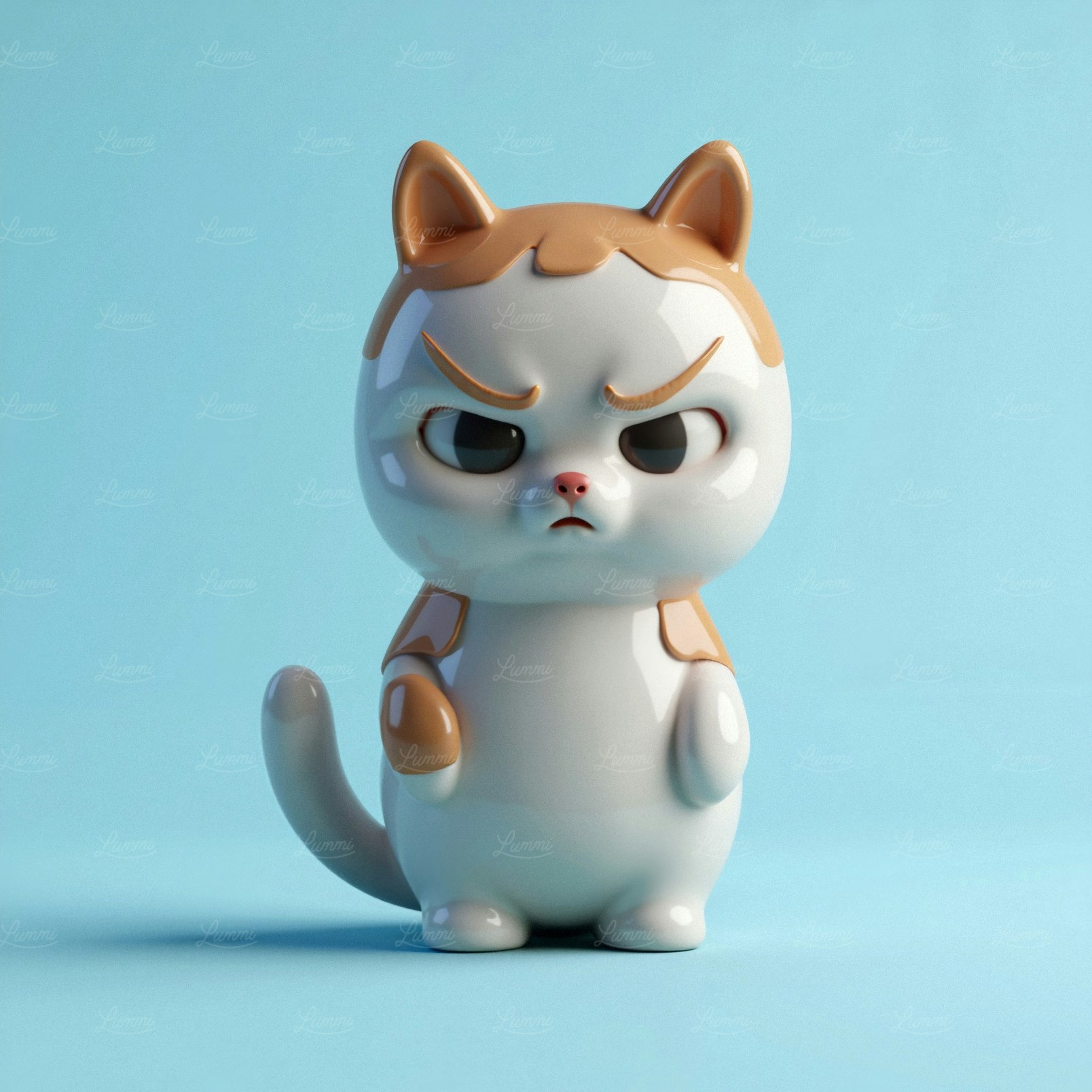Adorable 3D cartoon cat with a glossy finish and grumpy expression, featuring orange patches on a white body against a blue background.
