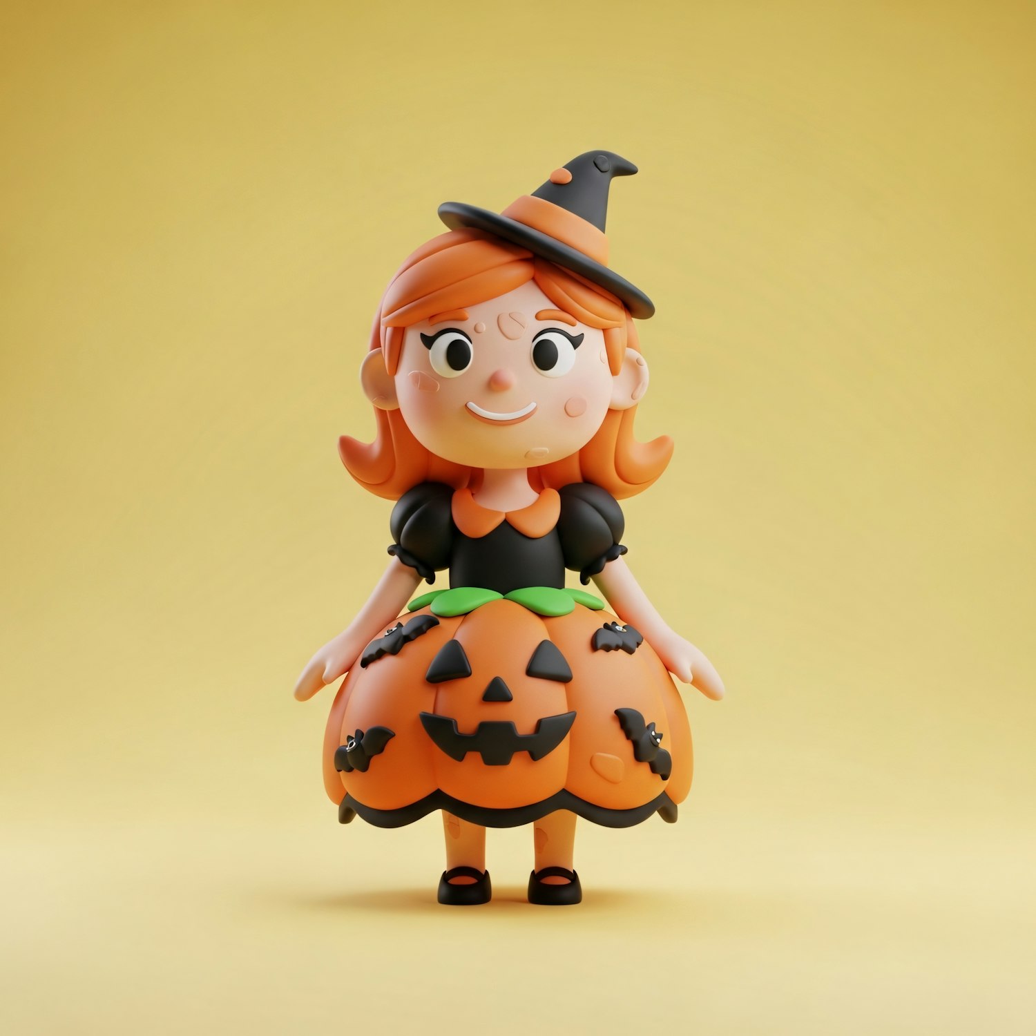 Adorable 3D cartoon character in a Halloween pumpkin dress and witch hat, set against a bright yellow background.