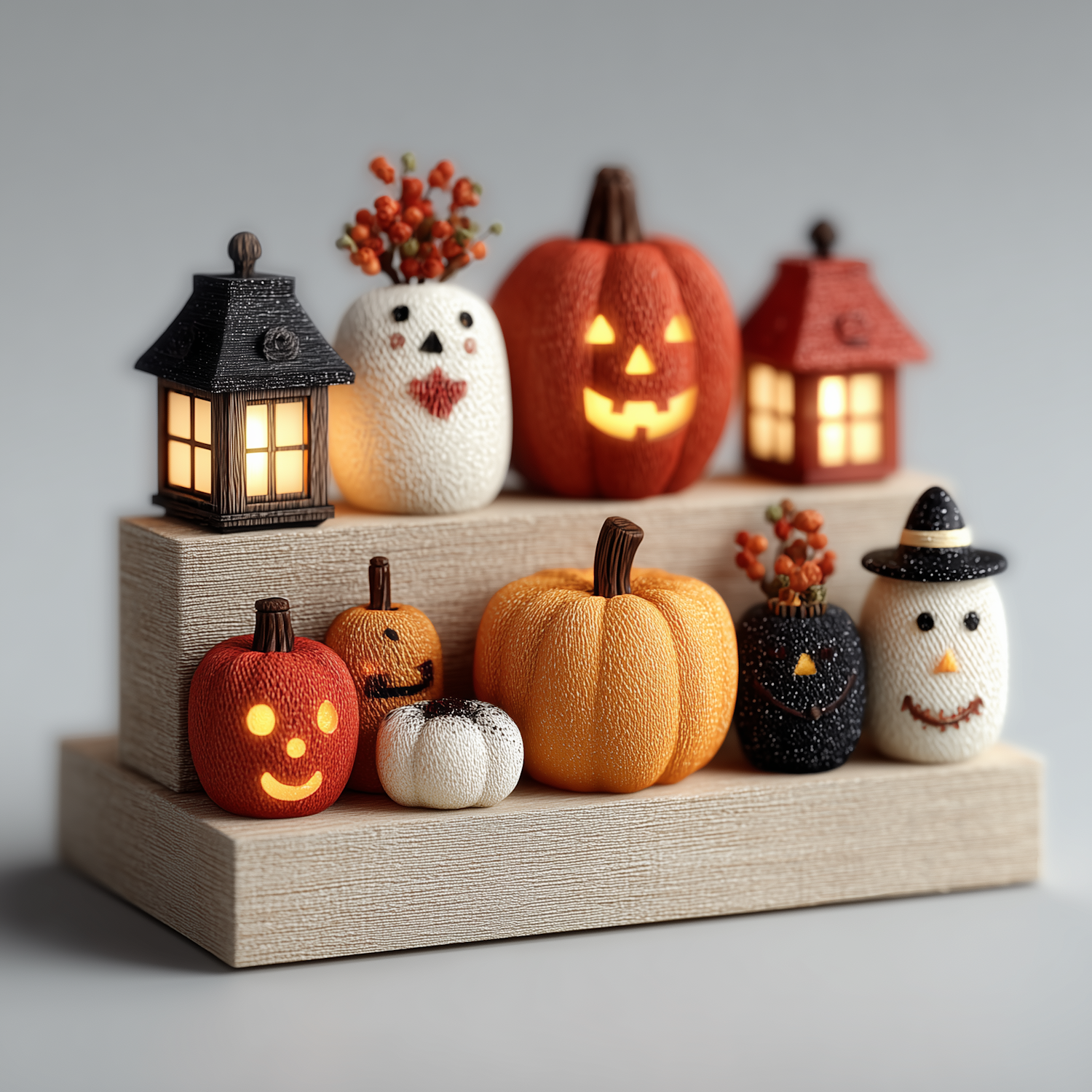 A festive Halloween display with pumpkins, glowing lanterns, and charming figurines on a wooden stand.