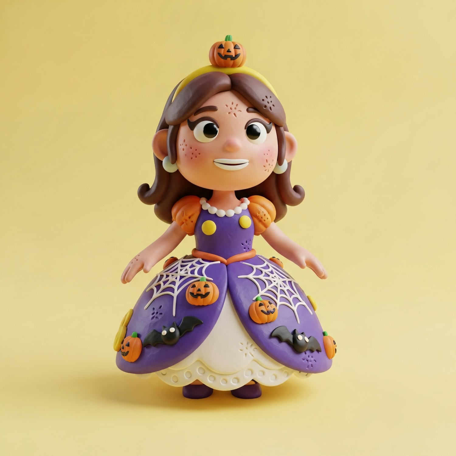 Adorable clay figurine of a girl in a Halloween-themed dress with pumpkins and bats, set against a light yellow background.