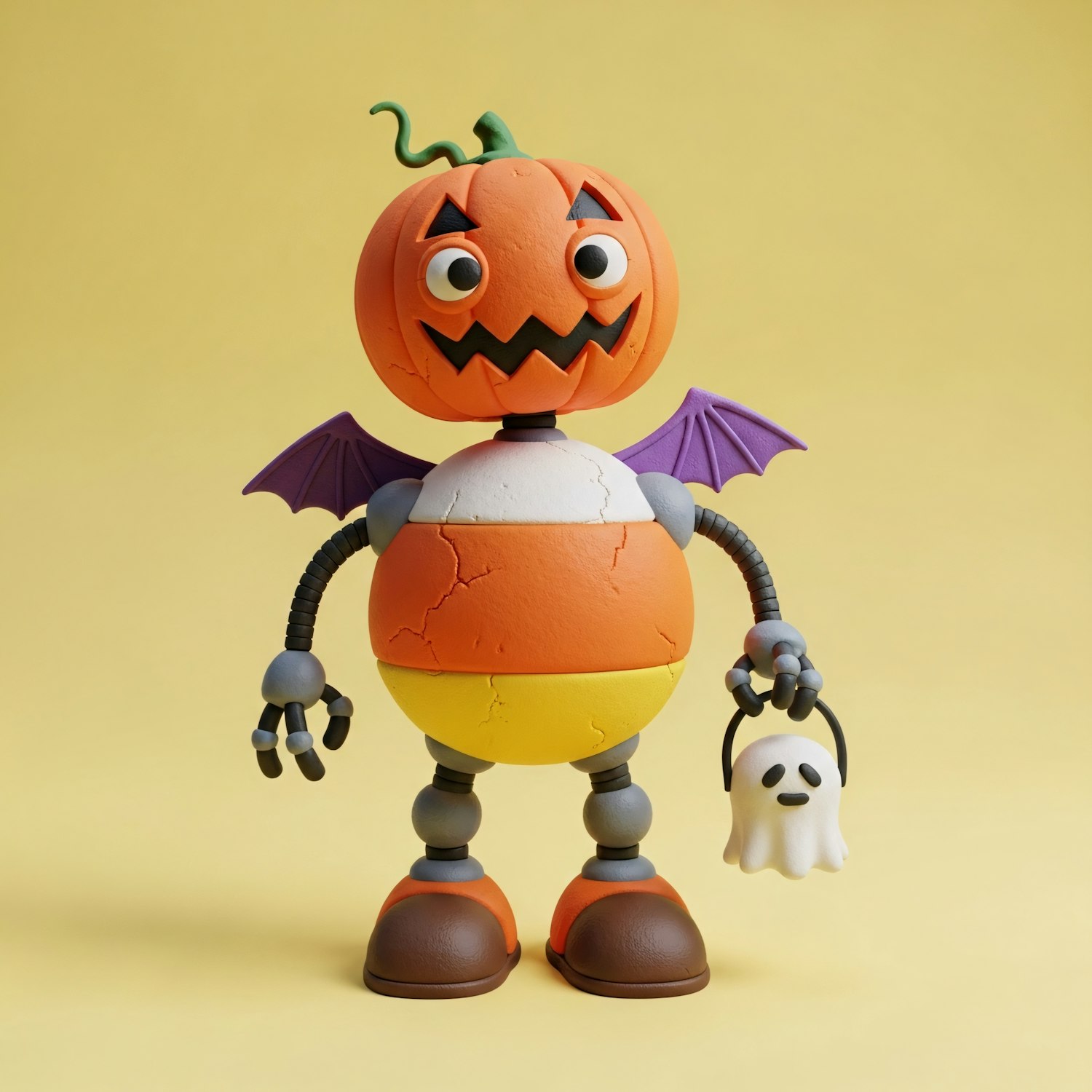A Halloween-themed robot with a pumpkin head, candy corn body, and ghost bucket, set against a yellow background.