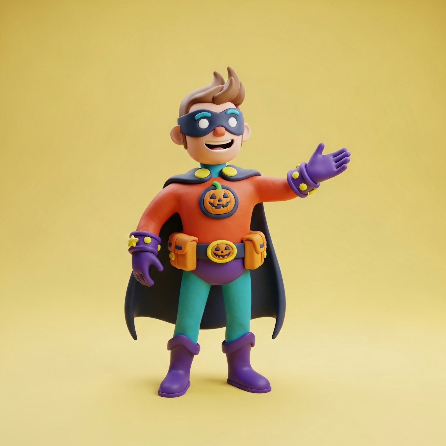 A cheerful 3D cartoon superhero with a Halloween theme, featuring a pumpkin emblem and vibrant colors, set against a yellow background.