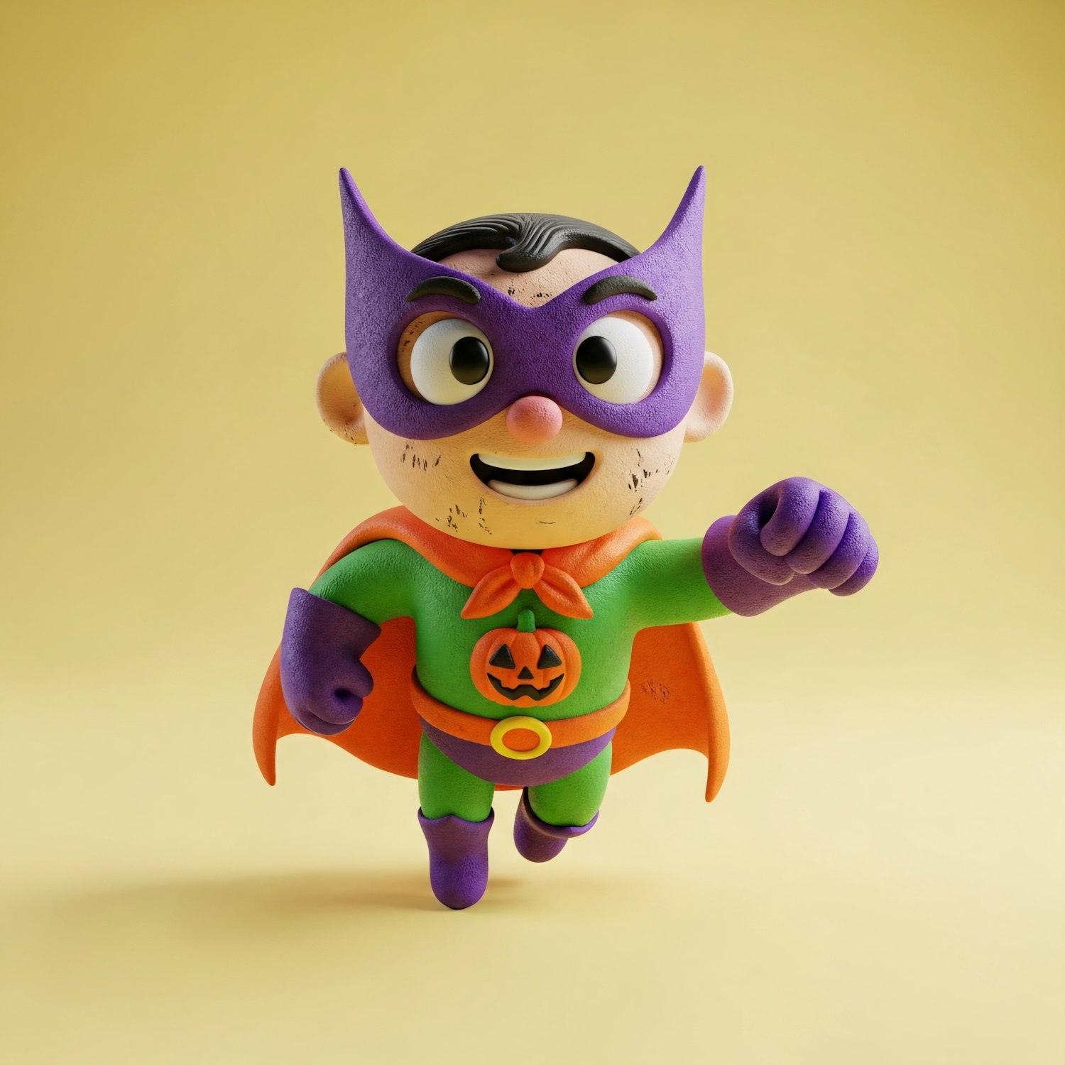 A colorful 3D cartoon superhero with a pumpkin emblem, purple mask, and orange cape, set against a light yellow background.