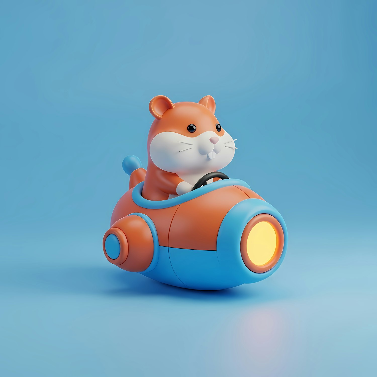Adorable 3D hamster driving a colorful orange and blue futuristic car with a glowing headlight, set against a light blue background.