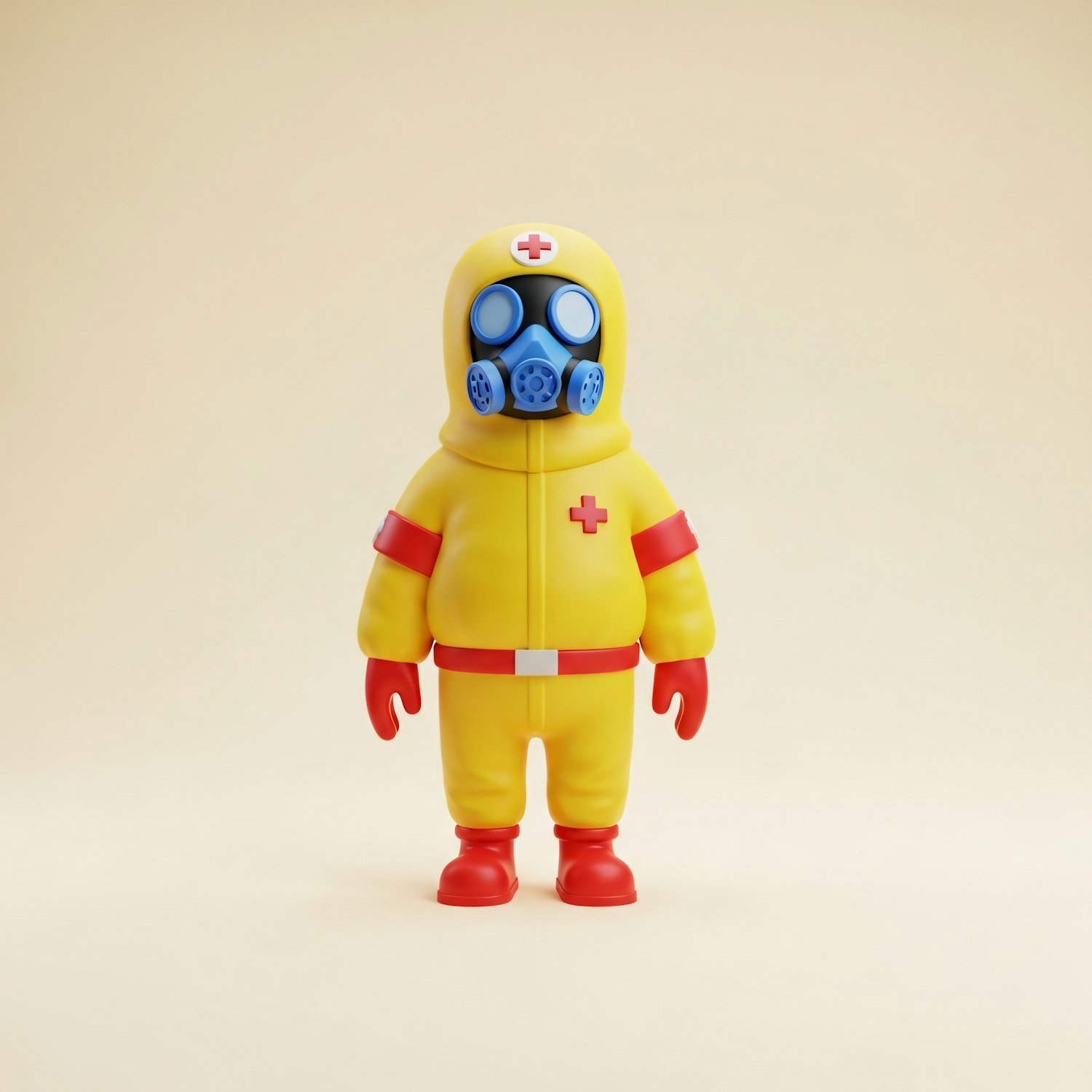 A colorful toy-like figure in a yellow hazmat suit with red accents and a blue gas mask, set against a neutral background.
