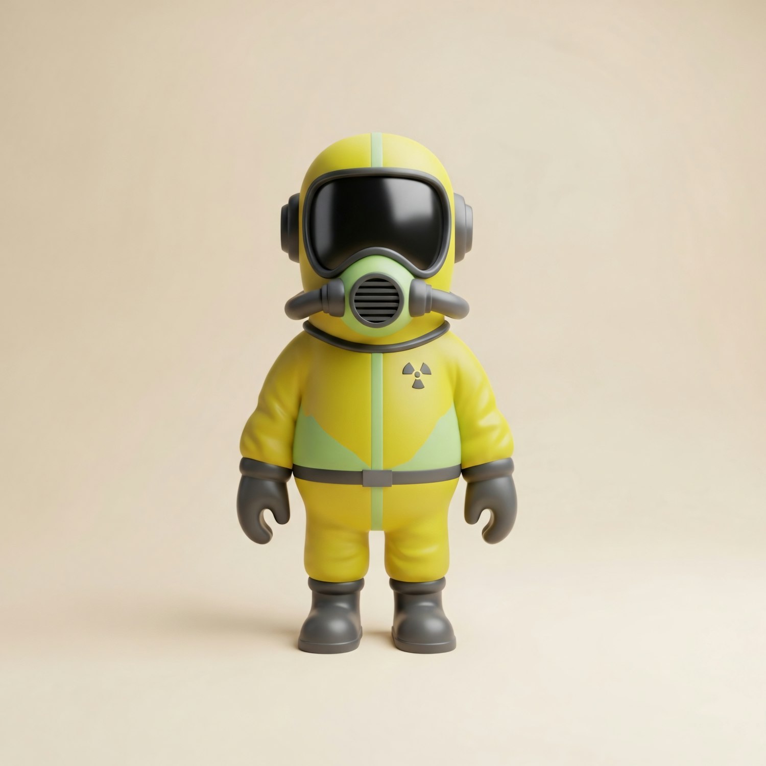 A 3D-rendered figure in a yellow hazmat suit with a radiation symbol, featuring a respirator and gray gloves, set against a beige background.
